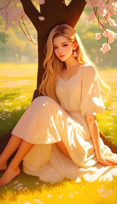 score_9,score_8_up,score_7,MAYE_X,The woman sits beside a large tree,with wavy golden hair. She is wearing a loose white dress,with her hands lightly placed on her knees. Her posture is very relaxed,as if she is contemplating or meditating. The surrounding environment is a sunny outdoor scene,with trees and grass showing vibrant green and yellow,and sunlight casting on her,creating a contrast of light and shadow. Blonde girl,white dress,under the tree,cherry blossoms falling,gentle breeze,fashion photography,soft tones,medium shot,natural light,defocus,elegance,