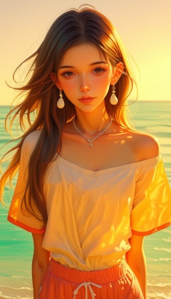 score_9,score_8_up,score_8,MAYE_X,A young woman by the seaside,with long,wavy brown hair that gently sways in the wind. Her eyes are bright and spirited,her skin fair and smooth,and her lips are slightly parted. She is wearing a loose white top that reveals her shoulders and a portion of her chest. The background is the ocean and beach at sunset,with the sky displaying shades of orange and red,and the sea reflecting the setting sun's rays.,