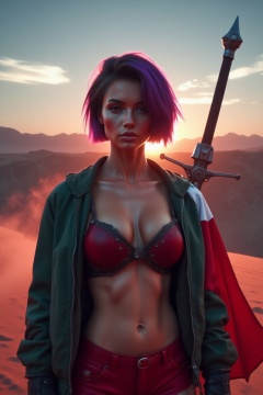 A young woman with short, vibrant purple hair stares into the camera, her gaze oozing sensuality and intimacy. She is wearing a partially open green jacket that subtly shows off her small breasts, accompanied by red shorts. She stands on a desert dune, surrounded by the soft hues of a dreamlike sunrise, with the warm light enhancing the surreal beauty of the scene..,polishswordsman