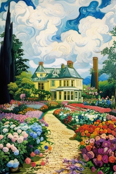 a painting of a garden of colorful flowers, Victorian manor in background, nimbus clouds, landscape,vangogh