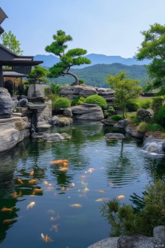 Panoramic view of pond with goldfish swimming in it, side view. The pond is surrounded by a series of gray rocks with a small waterfall in the middle where you can see brocade fish swimming in the water, adding color to the scene. The scene features pine trees, maples, mountains and clear blue sky in the background, modern garden, modern garden