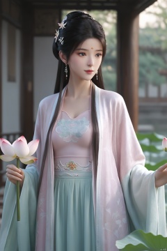 Morning Serenade In the gentle morning glow, (a woman in a pink lotus-patterned Hanfu stands in an indoor courtyard:1.26),(Chinese traditional dragon and phoenix embroidered Hanfu:1.3), admiring the tranquil garden scenery. The lotus-patterned Hanfu, embellished with silver-thread embroidery, is softly illuminated by the morning light. The light mint green Hanfu imparts a sense of calm and freshness, adorned with delicate lotus patterns, with a blurred background to enhance the peaceful atmosphere,(huge breasts:2.7),Xsutaner,Xhulianxin