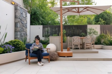 Captured from a high-angle perspective, a woman is seated on a blue chair reading a book. She is wearing a gray long-sleeved t-shirt, black pants, and white sneakers. Her hair is short and dark, and she is looking at the camera. The chair she is sitting on is made of wood, with a blue seat. The woman's legs are crossed, and her hair is pulled back in a ponytail. To the right of the woman, a white umbrella is attached to a wooden pole. Behind the umbrella, a table and chairs are arranged, and a white wall is adorned with plants and flowers. The wall is made up of gray stones, adding a touch of color to the scene.,modern garden
