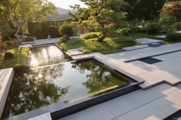 A serene modern garden scene: a meandering stepping stone path winds through a lush greenery of maple and pine trees, amidst a backdrop of beautiful scenery. The modern pavement pool's calm waters reflect the vibrant hues of the surrounding foliage, as warm sunlight casts a gentle glow on the tranquil atmosphere.