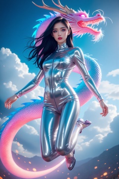 (masterpiece,top quality,best quality,official art,beautiful and aesthetic:1.2),(full body:1),Dynamic Angle,Perspective,High Point,pov,(Fisheye lens:1.2),jumping,blue eyes,A mature face,sideways glance,(cold attitude,eyeshadow,eyeliner:1.1),(red lips:1.2),watery eyes,A shot with tension,(sky glows,Visual impact,giving the poster a dynamic and visually striking appearance:1.2),Chinese Zen style,impactful picture,robotic girl,,JKBB,Multiple light sources on the body,,eastern dragon,