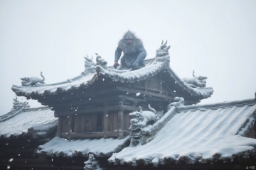 wukong_yanshangyue, the image shows a Meh-Teh standing atop a building covered in snow, with a few sculptures on the roof and a few trees in the background. the sky is visible at the top of the image.