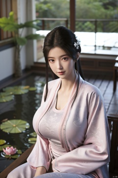 (((1gilr,black hair))),(Sitting on the lotus pond porch:1.39) ,(huge breasts:1.39),(A pond full of pink lotus flowers:1.3),close up of 1girl,Hairpins,hair ornament,hair wings,slim,narrow waist,perfect eyes,beautiful perfect face,pleasant smile,perfect female figure,detailed skin,charming,alluring,seductive,erotic,enchanting,delicate pattern,detailed complex and rich exquisite clothing detail,delicate intricate fabrics,