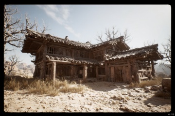 wukong_yanshangyue, the image shows an old wooden house in the middle of a desert, surrounded by trees and plants. the sky is visible in the background, and the image is framed with black borders at the top and bottom.