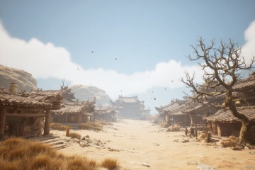 wukong_yanshangyue, the image shows an animated scene of a village in the middle of a desert, with a few buildings on the left and right side of the image, a tree on the right side, and a few birds flying in the air. the sky is visible at the top of the picture, giving the impression of a peaceful and serene atmosphere.