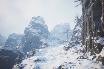 wukong_yanshangyue, the image shows a snow-covered mountain with a path winding through it, surrounded by rocks and trees. the sky in the background is filled with clouds, creating a picturesque winter scene.