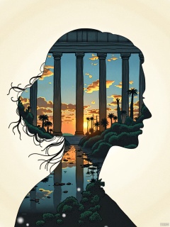 silhouette of a priestess princess filled with a greek temple scenery, double exposure, crisp lines, double exposure background, hyperdetailed, concept art