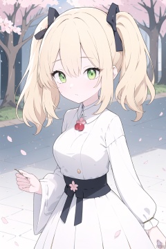 anime screencap, masterpiece, best quality, elegant, beautiful eyes, cute face, gorgeous face, perfect body, digital photography, medium hair, wavy hair, side ponytail, blonde hair, green eyes, white dress, medium breasts, narrow waist, glitter, close-up, outdoors, cherry blossoms, street<lora:EMS-467687-EMS:1.000000>