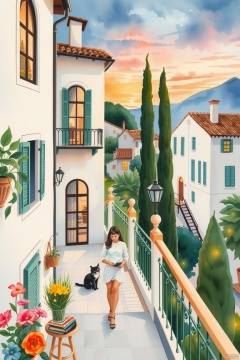 Cozy watercolor painting, art Deco, house, in an Italian town, flowers, Girl in white, cats, books,in summer, White House, neutral pastel color palette, sunset night, cozy lights, green plants, cypress trees, cozy balcony,