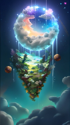 (Magic Universe, Fantasy style) Looking at the universe from a small perspective, multidimensional clouds are plants that float in different dimensions, their appearance is like suspended clouds in the air, but each layer of these clouds presents a different color and texture. Each level of the floating cloud is actually a slice of a different space that overlaps in the air to create a psychedelic visual effect. The outer layer of the floating cloud is made of a transparent curtain of light, in which you can see twinkling stars and flowing energy streams
