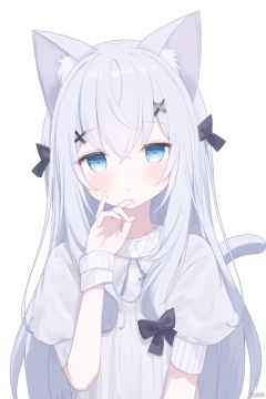 anime,1girl,solo,animal ears,cat ears,tail,blue eyes,puffy sleeves,cat tail,puffy short sleeves,short sleeves,long hair,hair between eyes,hair ornament,wrist cuffs,grey hair,cat girl,bangs,hand up,bow,blush,bare shoulders,very long hair,looking at viewer,animal ear fluff,x hair ornament,black bow,detached