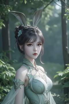Produce a 4K, high-resolution masterpiece image of a graceful 1girl,xiaowu,black hair,Rabbit ears,full body,The image is ultra-detailed and photorealistic, showcasing historical elegance. The intricate updo hairstyle complements the bewildering yet charming expression, highlighted by beautiful detailed eyes,and high-detail facial features. The scene is set in a serene forest clearing under the moonlight, with a mystic and ethereal atmosphere. Soft jade and ivory colors blend with the undergrowth's verdant greenery and subtle ambient shadows, reflecting an ancient Chinese cultural aesthetic. The spirit's magnetic presence is enhanced by diaphanous sleeves fluttering slightly in the gentle breeze.,xiaowu