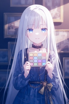 An animated image of a girl with long white hair and blue eyes. She is wearing a blue dress with a black belt and a gold bow on her waist. The girl is holding a square game in her hands. The game is made up of squares of different colors. There is a black collar around her neck. There are gold chains hanging from the belt. The wall behind the girl is purple.