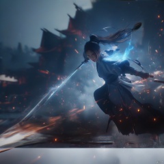 holding light-sword, 1girl, solo, particle effects, spark, holding ice-sword, weapon, sword, holding sword, black hair, hair bun, holding, holding weapon, blue eyes, single hair bun, looking at viewer