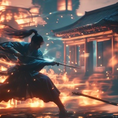 male, aura, realistic movie stills, flame, holding sword, war, ancient chinese martial arts style, dynamic, spark, solo, male focus, long hair, black hair, ponytail, fire, east asian architecture