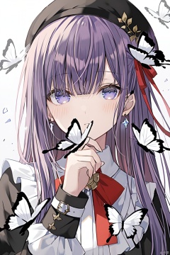 1girl,bangs,blue_butterfly, bug, butterfly,flower_on_hand, covering_mouth, dragonfly, earrings, eyebrows_visible_through_hair, glowing_butterfly, hair_ribbon, jewelry, long_hair, looking_at_viewer, matou_sakur, purple_eyes, purple_hair, red_ribbon, ribbon, solo, white_butterfly