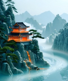 jade carving,Captured from a low-angle perspective,a Japanese temple stands on a cliff overlooking a body of water. The temple's roof is adorned with a black roof,and the walls are adorned with orange lanterns. The roof is made of wood