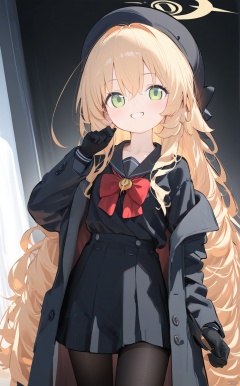 (score_9,score_8_up,score_7_up),1girl,(masterpiece:1.3),( beautiful:1.2),(high quality:1.2),(finely detailed:1.2),extremely detailed CG unity 8k wallpaper,best quality,a very delicate and beautiful,perfect fingers,(one cute girl at the center:1.2), 1girl, solo, long hair, looking at viewer, blush, smile, bangs, skirt, blonde hair, shirt, gloves, long sleeves, hat, bow, hair between eyes, school uniform, green eyes, jacket, pantyhose, pleated skirt, open clothes, serafuku, black gloves, bowtie, black skirt, sailor collar, off shoulder, red bow, black jacket, ((black pantyhose)), black shirt, black headwear, beret, halo, thighband pantyhose,niyaBA,white backgroud