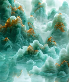 jade carving,Captured from a high-angle perspective,a detailed detailed view of a waterfall is depicted. The waterfall is made up of a variety of rocks,each with a unique texture and design. The rocks are covered in a layer of water,creating a stark contrast with the waterfall. The water is a light blue,with a reflection of the rocks in the water,adding a touch of nature to the scene. The scene is entirely entirely entirely blurred,with the rocks and trees in the foreground and the background in the background.