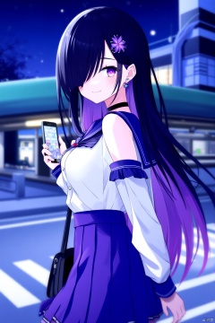 1girl, solo, long hair, breasts, looking at viewer, smile, bangs, skirt, shirt, black hair, hair ornament, long sleeves, holding, bare shoulders, jewelry, school uniform, standing, purple eyes, white shirt, purple hair, flower, multicolored hair, pleated skirt, earrings, outdoors, frills, parted lips, detached sleeves, serafuku, solo focus, choker, looking back, hair flower, sailor collar, bag, from behind, hair over one eye, two-tone hair, blue skirt, night, black choker, phone, cellphone, blue sailor collar, building, smartphone, holding phone, purple skirt, high-waist skirt, shoulder bag, colored inner hair, city, purple flower, shirt tucked in, road, street, black bag, train station, crosswalk,anime