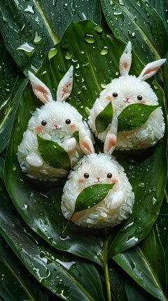 <lora:端午节——创意粽子_V1.0:0.8>,highly detailed,ultra-high resolutions,32K UHD,best quality,masterpiece,tao, chi, the painting is a creative representation of three rice balls, artistically designed to resemble rabbits. they are placed on a bed of large green leaves, with water droplets scattered around. the artistic style is whimsical and playful, emphasizing the natural colors and textures of the rice, leaves, and water. the composition is balanced, with the rabbits placed symmetrically, and the green leaves adding a contrasting background.