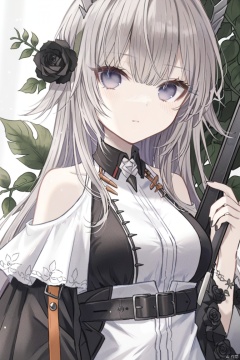 1girl, bangs, bare_shoulders, black_flower, blush, breasts, eyebrows_visible_through_hair, flower, hair_between_eyes, hair_flower, holding, large_breasts, leaf, looking_at_viewer, plant, rose, solo, upper_body, weapon, white_flower, white_rose,vendela_\(arknights\)