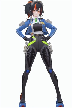 8k, best quality, masterpiece, (ultra-detailed), (high detailed skin), (full body:1.25), (white background:1.4), (simple background), standing, looking at viewer, (solo:1.2), hands on hips, <lora:zhuyuan-sd-Tanger:0.9>, zhuyuan, default clothes, Police combat uniforms, 1girl, multicolored hair, black hair, blue jacket, gloves, streaked hair,