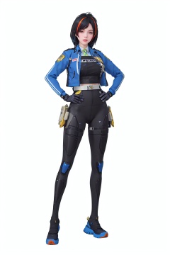 8k, best quality, masterpiece, (ultra-detailed), (high detailed skin), (full body:1.25), (white background:1.4), (simple background), standing, looking at viewer, (solo:1.2), hands on hips, <lora:zhuyuan-sd-Tanger:0.75>, zhuyuan, default clothes, Police combat uniforms, 1girl, multicolored hair, black hair, blue jacket, gloves, streaked hair,