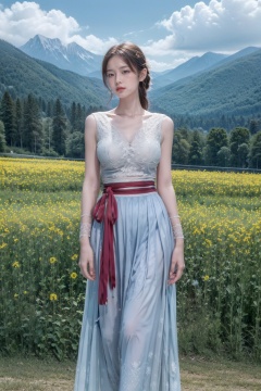 Realistic,masterpiece,best quality,8K,HDR,RAW,1girl,((solo)),(Spring scenery, mountains in the distance, beautiful clouds, rape flower fields),(standing),large breasts,Looking at the audience,(up body:1.2), <lora:add_detail:0.6>,<lora:GoodHands-beta2:1>,<lora:ENNE国风套装_v2_10:0.9>,chinese clothes,