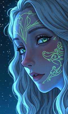 Create a close-up image of a fantasy elf’s face. Her skin glows with a soft, ethereal light and is adorned with neon tattoos that cover her face in intricate patterns. The tattoos emit a magical glow that illuminates her delicate features. Her eyes are large and bright, subtly changing between shades of blue and green, as if holding an ocean within them. Her long, silver hair frames her face, adding a touch of magic to the scene. The background features a starry sky that enhances the dreamy atmosphere , fantasy art