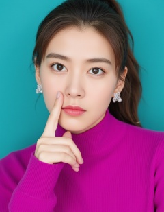 <lora:Asian_women:1>This is a high-resolution photograph of a young woman with a fair complexion, light brown hair styled in a high ponytail with loose strands framing her face. She has large, expressive brown eyes with subtle makeup, including a light pink blush and natural-looking lipstick. Her facial expression is neutral, with a slight pout, and she gazes directly at the camera.She is wearing a vibrant, magenta high-necked turtleneck sweater made of a soft, ribbed fabric that appears to be cotton or a similar blend. The sweater contrasts sharply with the teal background, which is a solid, textured surface that adds depth to the image.Her right hand is delicately positioned near her face, with her index finger pointing upwards, suggesting a moment of contemplation or thought. She is also wearing large, clear flower-shaped earrings that add a touch of whimsy and elegance to her look.The lighting is soft and even, highlighting her features and the textures of her hair and clothing without harsh shadows. The overall style of the photograph is contemporary and fashion-forward, emphasizing the subject's youthful beauty and unique sense of style.