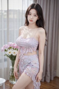 Realistic,(masterpiece:1.2),best quality,8K,HDR,RAW,1girl,((solo)),(Simple background, vase,Film lighting),(Black hair,delicate girl),large breasts,standing,Behind the hands,(Looking at the audience),<lora:add_detail:0.6>,<lora:GoodHands-beta2:1>,<lora:ENNE 吊带短裙_v3_09:1>,skirt,suspenders,