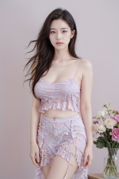 Realistic,(masterpiece:1.2),best quality,8K,HDR,RAW,1girl,((solo)),(Simple background, vase,Film lighting),(Black hair,delicate girl),large breasts,standing,Behind the hands,(Looking at the audience),<lora:add_detail:0.6>,<lora:GoodHands-beta2:1>,<lora:ENNE 吊带短裙_v3_09:1>,skirt,suspenders,