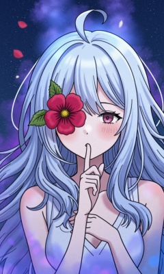 A dynamic and emotional anime portrait of a woman with flowing white hair. Ethereal blue and purple mist surrounds her, creating a surreal effect. A blooming red flower covers one eye, adding a touch of mystery. The background is a dark blue, filled with falling petals. The woman holds a finger to her lips in a shushing motion.