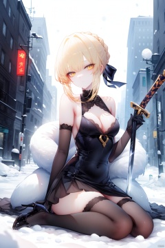 1girl, solo, artoria pendragon \(fate\), gloves, thighhighs, saber alter, yellow eyes, breasts, blonde hair, elbow gloves, weapon, sword, sitting, snow, excalibur morgan \(fate\), high heels, dress, small breasts, looking at viewer, black thighhighs, cleavage, snowing, black gloves, braid, ribbon, bare shoulders, black dress, hair ribbon, yokozuwari, lolita fashion, pale skin, short hair, sleeveless