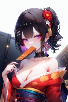 hair ornament, 1girl, solo, hairclip, purple eyes, flower, bangs, black hair, hand fan, hair flower, holding, japanese clothes, kimono, red flower, holding fan, upper body, breasts, red kimono, black background, cleavage, hairpin, looking at viewer, blunt bangs, jewelry, earrings, nail polish, hand up, folding fan, collarbone, red nails, off shoulder, covered mouth, covering mouth, medium breasts, fingernails, short hair, simple background, makeup, pink nails