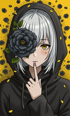 This acrylic style painting is extremely expressive and presents a dynamic and emotional quality. This is a piece of anime art that depicts a stylized portrait of a woman with an ethereal black and yellow mist surrounding her body. The mist creates a dramatic and surreal effect. A blooming black flower covers one eye on the face. White hair sets off the woman's cold beauty. The woman in the anime artwork is shrouded in shadows and the lighting accentuates her unique features. The background is yellow and black and covered with black rose petals. Fingers are placed on lips in a shhh, shhh motion,