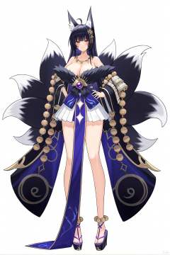 score_9, score_8_up, score_7_up, score_anime, nai3, <lora:YLI 0.1v:0.5>, <lora:style1:0.5>, 8k, best quality, masterpiece, (ultra-detailed), (white background,simple background), solo, (hands on hip:1.1), (full body:1.1), looking at viewer, <lora:wuzang-atw-Tanger:0.8>, uzang, default clothes, 1girl, magatama necklace, tail, magatama, fox ears, solo, long hair, jewelry, fox tail, japanese clothes, cleavage, black hair, necklace, large breasts, facial mark, fur trim, multiple tails, fox girl, kimono, beads, prayer beads,