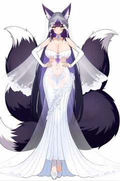 8k, best quality, masterpiece, (ultra-detailed), (white background,simple background), solo, (hands on hip:1.1), (full body:1.1), looking at viewer, <lora:wuzang-a3-Tanger:0.8>, official alternate costume, wuzang, wedding dress, 1girl, animal ears, solo, tail, dress, long hair, fox ears, large breasts, yellow eyes, purple eyes, white dress, bridal veil, purple fox tail, see-through,