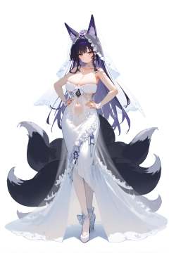 score_9, score_8_up, score_7_up, score_anime, nai3, <lora:YLI 0.1v:0.5>, <lora:style1:0.5>, 8k, best quality, masterpiece, (ultra-detailed), (white background,simple background), solo, (hands on hip:1.1), (full body:1.1), looking at viewer, <lora:wuzang-pony-Tanger:0.8>, official alternate costume, wuzang, wedding dress, 1girl, animal ears, solo, tail, dress, long hair, fox ears, large breasts, yellow eyes, purple eyes, white dress, bridal veil, fox tail, multiple tails,