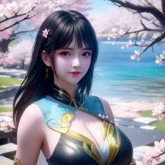 <lora:739-DA-斗破苍穹-慕青鸾:0.8>, (,1girl, ,best quality, ),looking at viewer,  ultra detailed background,ultra realistic 8k cg,ultra detailed 8k cg,masterpiece,upper body,  (( , )),, ,science fiction,mole, ultra realistic 8k cg, ,    ,outdoors, sun,sunlight, cherry blossoms,      (cleavage), (),