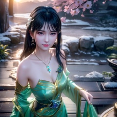 <lora:739-DA-斗破苍穹-慕青鸾:0.8>, (,1girl, ,best quality, ),looking at viewer,  ,,ultra detailed 8k cg, ultra detailed background ,ultra realistic 8k cg,          cinematic lighting, cinematic bloom, (( , )),,  , unreal, science fiction,  luxury, jewelry, diamond, pearl, gem, sapphire, ruby, emerald, intricate detail, delicate pattern, charming, alluring, seductive, erotic, enchanting, hair ornament, necklace, earrings, bracelet, armlet,halo,masterpiece, (( , )),, realistic,science fiction,mole,   ,cherry blossoms,,(((Best quality, masterpiece, ultra high res, (photorealistic:1.4), raw photo, 1girl, ,rain, , sunlight, sunset, qianqiu wanxia,     )))  (cleavage), (),