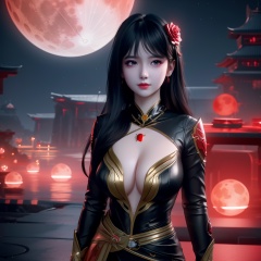 <lora:739-DA-斗破苍穹-慕青鸾:0.8>, (,1girl, ,best quality, ),looking at viewer,  ,,ultra detailed background,ultra detailed background,ultra realistic 8k cg,, ,masterpiece, (( , )),, ,science fiction,mole, ,    ,red moon, black rose,     (cleavage), (),