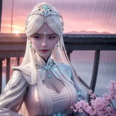 <lora:741-DA-万界独尊-杨天雪:0.8>, (,1girl, ,best quality, ),looking at viewer,  ,,ultra detailed 8k cg, ultra detailed background ,ultra realistic 8k cg,          cinematic lighting, cinematic bloom, (( , )),,  , unreal, science fiction,  luxury, jewelry, diamond, pearl, gem, sapphire, ruby, emerald, intricate detail, delicate pattern, charming, alluring, seductive, erotic, enchanting, hair ornament, necklace, earrings, bracelet, armlet,halo,masterpiece, (( , )),, realistic,science fiction,mole,   ,cherry blossoms,,(((Best quality, masterpiece, ultra high res, (photorealistic:1.4), raw photo, 1girl, ,rain, , sunlight, sunset, qianqiu wanxia,     )))  (cleavage), (),