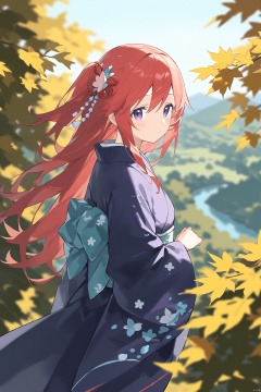 1girl,red hair,purple eyes,furisode,blurry,blurry_foreground,blurry_leaf,landscape,from_above,cowboy_shot,long hair