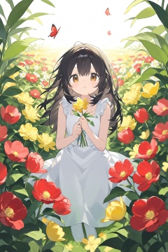 1girl, bangs, bare_arms, bare_shoulders, berry, black_hair, blunt_bangs, bouquet, brown_eyes, bug, butterfly, camellia, daisy, dandelion, dress, floral_print, flower, flower_field, hibiscus, holding_flower, leaf, long_hair, looking_at_viewer, nail_polish, orange_flower, parted_lips, plant, red_flower, red_nails, red_rose, sitting, sleeveless, solo, spider_lily, sunflower, tulip, yellow_flower